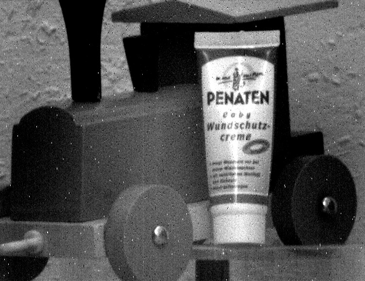 Result of the Watec: Summed-image of 800 seconds integration time (80 images), dark images have been subtracted. The scene can be recognized, but the image is seriously damaged by the dark spots that were left after subtracting the dark image. A more sophisticated image processing could smooth over the dark spots, and improve the visual impression of the image, but the information is destroyed at these locations. |