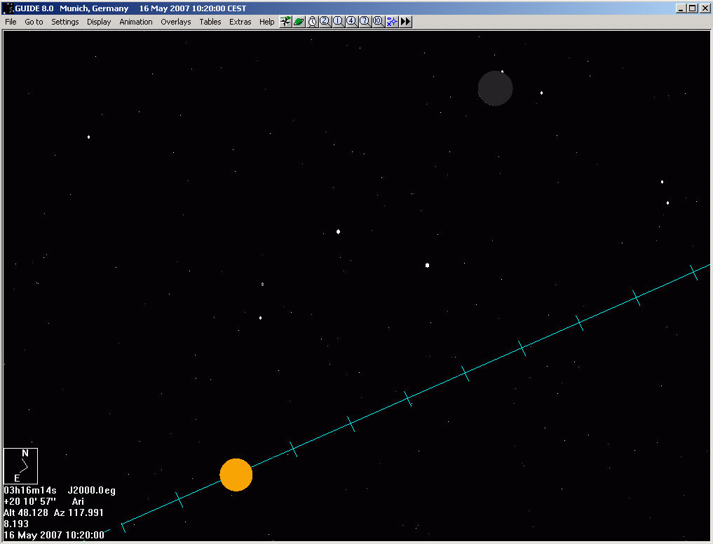 Die Mondsichel selber in der Darstellung durch Guide 8. Die Darstellung der Sichel ist aber rein geometrisch, sichtbar ist die so nicht vom Boden aus.