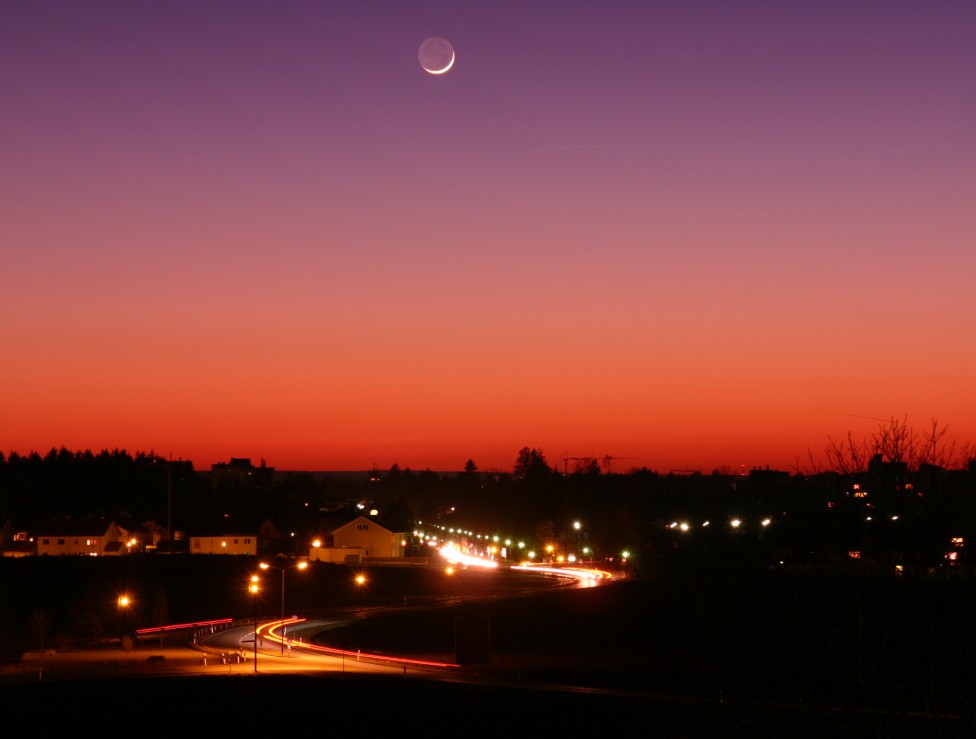 Die Mondsichel in der Abenddämmerung des 8. Februar 2008 über dem Westhorizont.