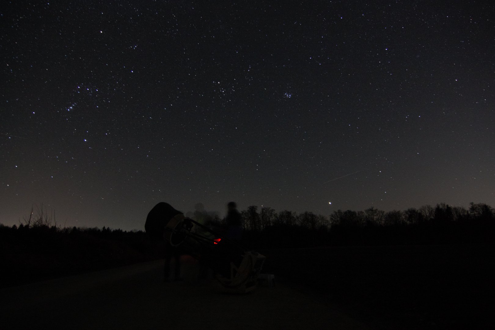Die erste Exkursion hat diesmal noch vor Ende des Kurses stattgefunden. An einem Wochentag haben sich fast 20 Beobachter (und ein Säugling) bei guten Bedingungen in Kreuzstrasse eingefunden, darunter auch Alumni früherer Kurse. Durch den Ruhetag des Bartewirts war es vor Ort recht dunkel, das Licht beim Chalet haben wir später wieder abgedeckt. Es stand diesmal nur ein Milchwagen auf dem Weg. Die Autos aus Westen waren aushaltbar, vielleicht können wir da aber doch noch was verbessern.