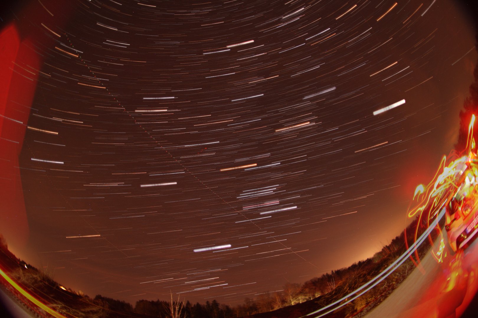 Strichspur mit der roten Canon und einem 8mm Fishheye. Das Objektiv hat bei Offenblende fröhliche Unschärfen und eh ein Problem mit Streulicht. Aber es kriegt halt auch viel vom Umfeld mit drauf...