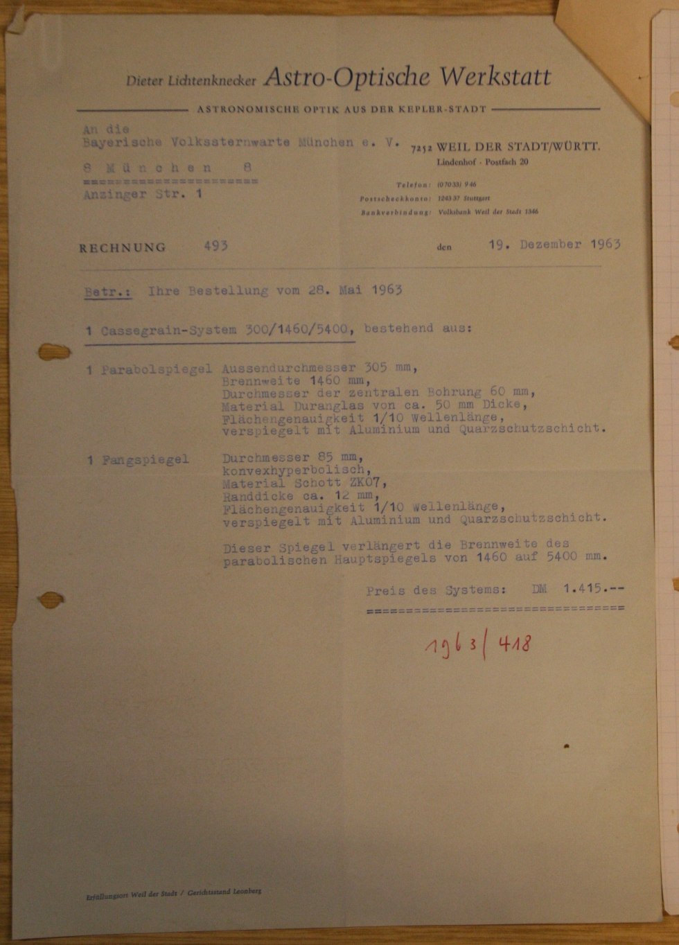 Rechnung aus dem Jahr 1963 mit allen Daten der Optik